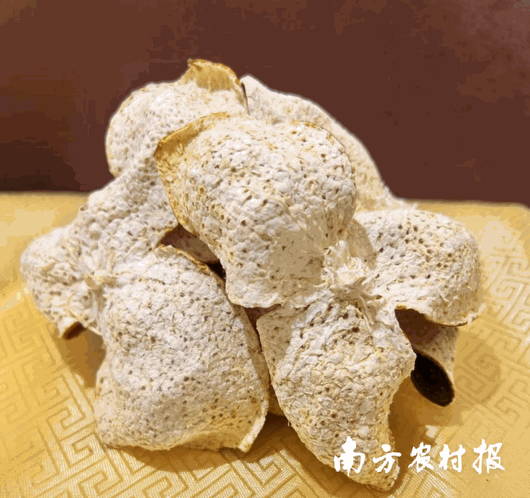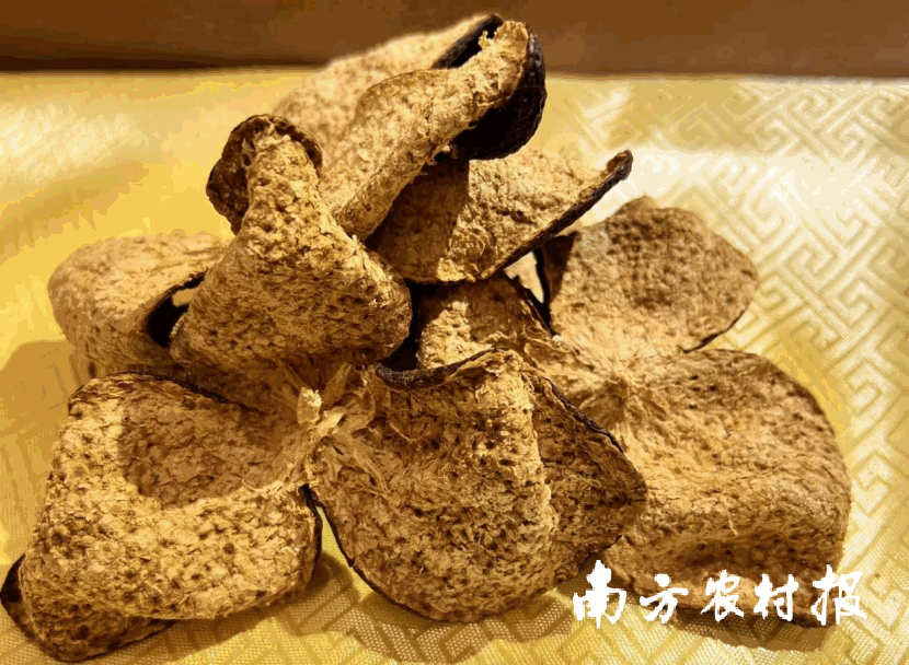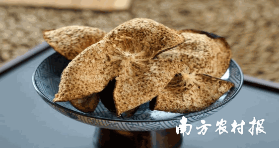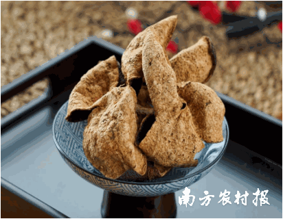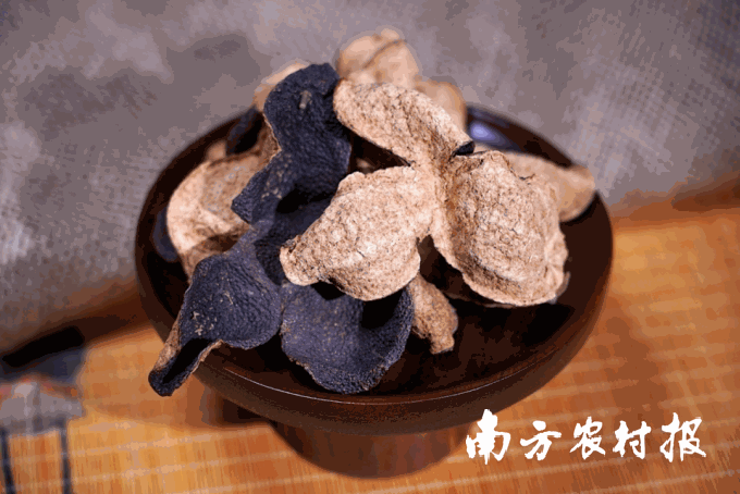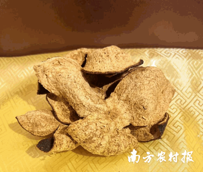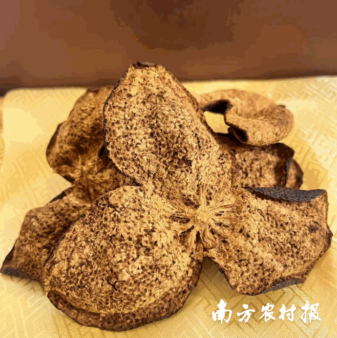 外观特征:颜色呈棕色,果皮细纹凹凸明显,猪紫纹理清晰,外形发生蜷缩,内囊自然泛黄带棕,有轻微脱落现象,油胞粒越发明显。