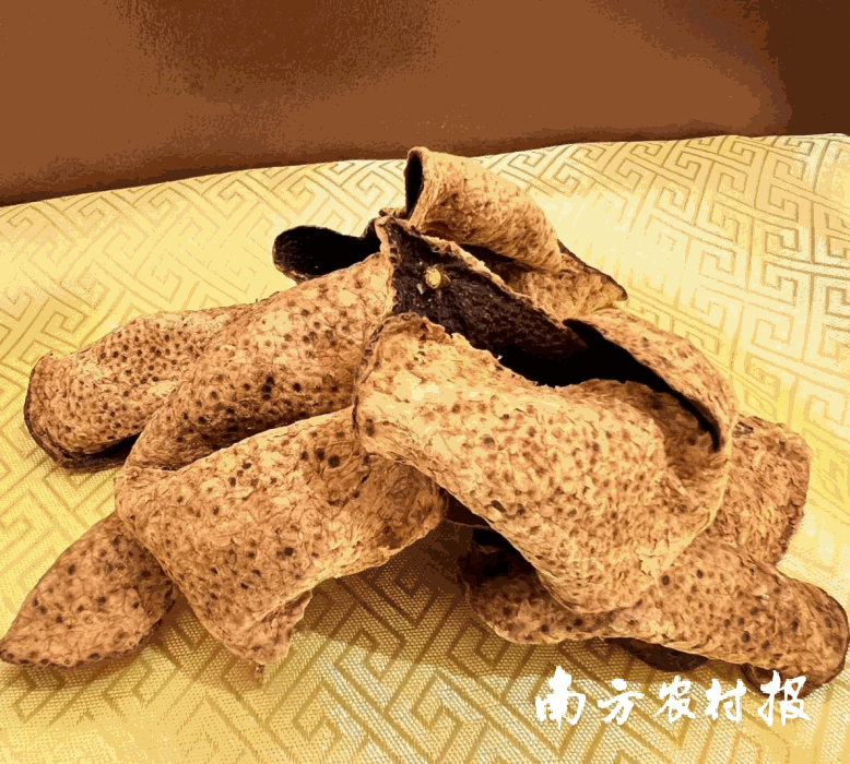 外观特征:外皮褐色,内囊偶有脱落,油室点透明显分布均匀,呈现出“猪鬃皮”质感。油润光泽,猪鬃纹路明显,质地硬、韧,形状上,因陈化过程有明显收缩而卷起对折。